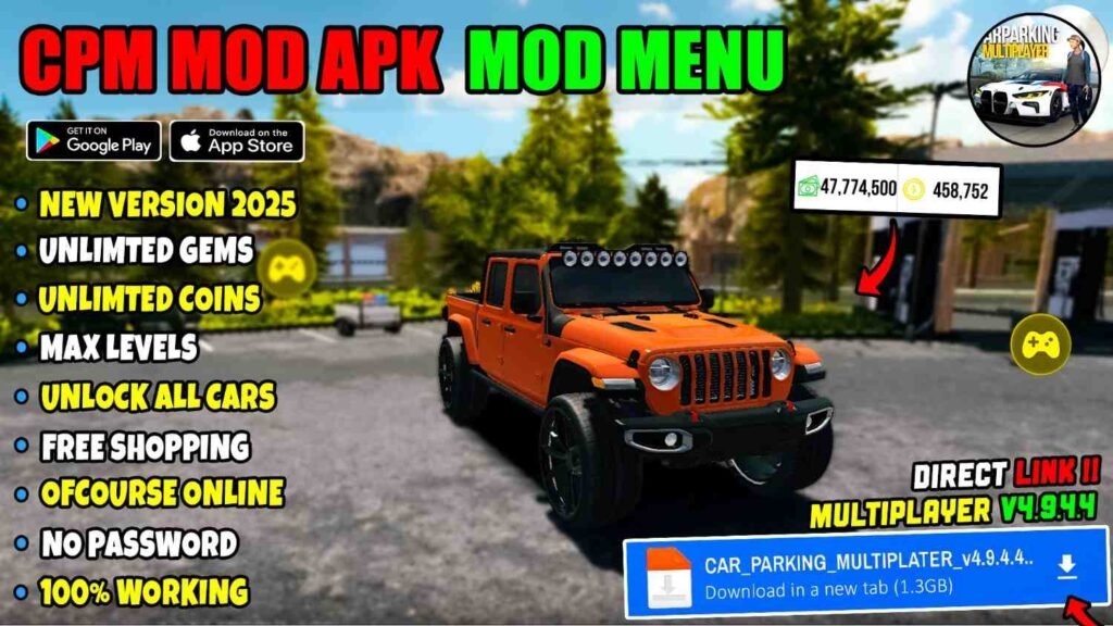 The CPM MOD APK v4.9.4.4 (2025 Update) is the latest and most advanced version of Car Parking Multiplayer, the popular open-world driving and parking simulator. Loved for its realistic physics, multiplayer gameplay, and massive collection of vehicles, CPM continues to dominate the mobile racing category. With this new modded version, you can now enjoy Unlimited Money, Unlimited Coins, All Cars Unlocked, All Clothes Unlocked, and Free Shopping from the very beginning.