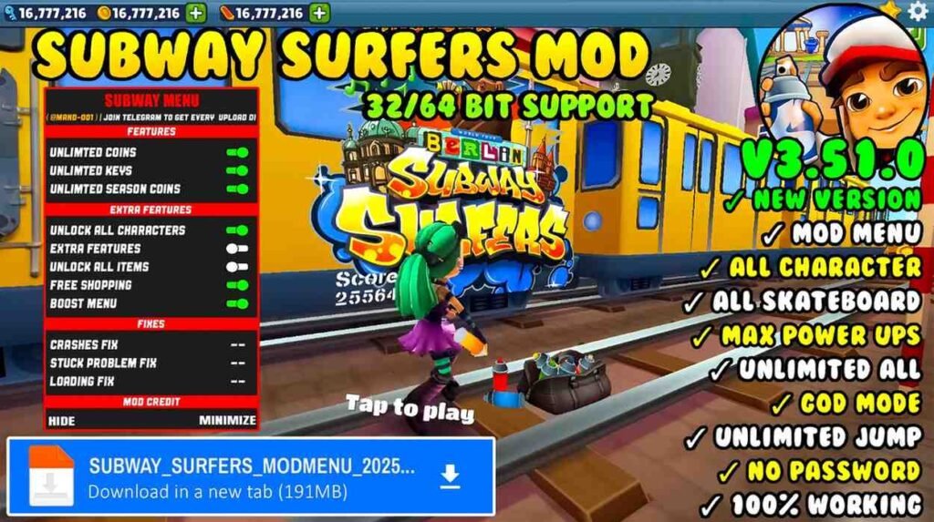 The Subway Surfers MOD Menu APK v3.51.0 (2025 Latest Update) is the ultimate upgrade for endless runner fans. With unlimited coins, keys, unlocked characters, hoverboards, and ad-free gameplay, it’s a must-download for those who want the full experience.